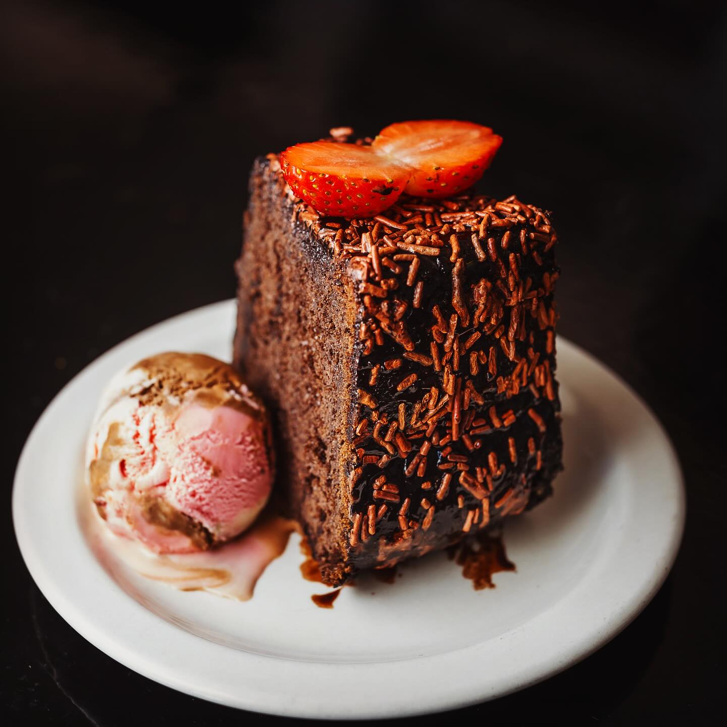 Bolo macio e húmido de chocolate intenso, preparado com ingredientes selecionados, perfeito para finalizar a refeição com um toque doce e reconfortante.