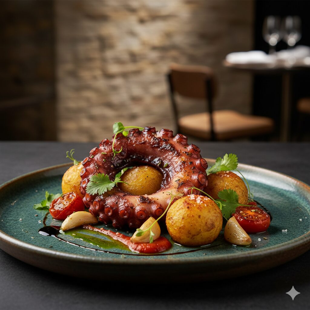 Polvo confitado com batata a murro, azeite de alho negro e espuma de coentros